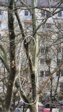 Ein dicker Ast hängt gerade noch am Baum, drigt jedoch herunterzufallen.