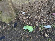 Verschiedener Restmüll liegt in der Grünanlage wo der Marker gesetzt ist, an dem Fußweg der Stichstraße parallel zum Diakon Kerolt Weg (s