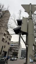 Rot der Fußgängerampel leuchtet fast nicht, siehe Ampel im Hintergrund im Bild