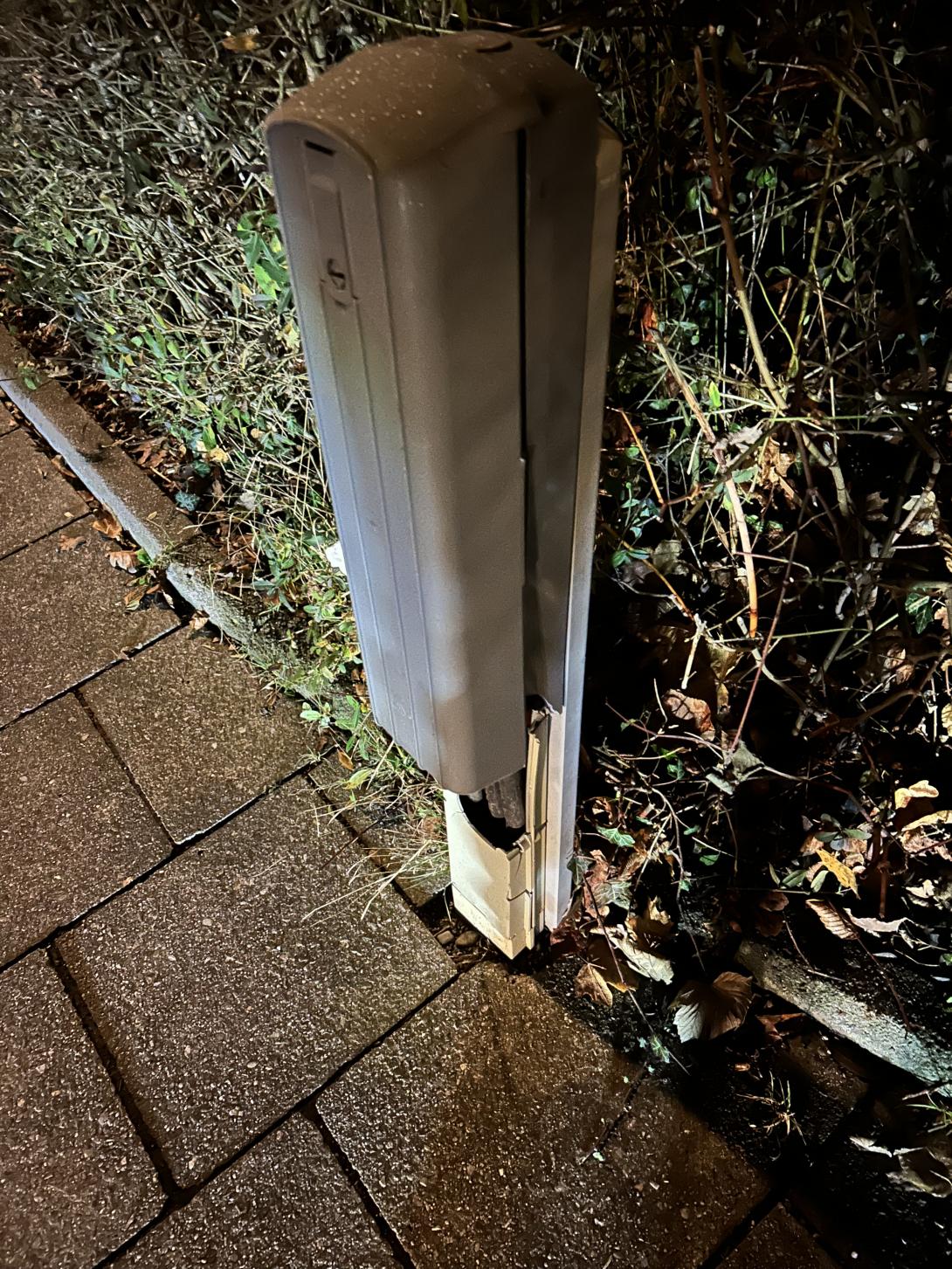Stromverteilerkasten, vermutlich für Stassenlaternen, beschädigt. Standort: Gehweg Kapruner Str. Ecke Mitterfeldstasse. Kabel sind freigelegt. Potentielle Gefahr für Passanten.