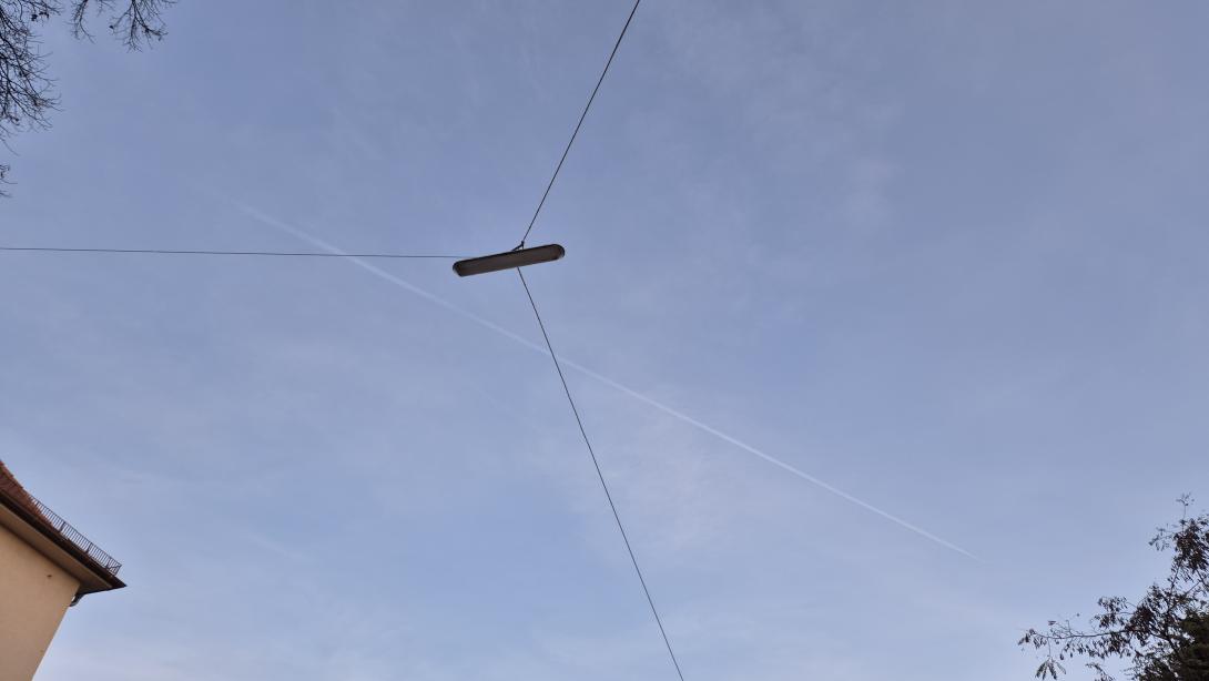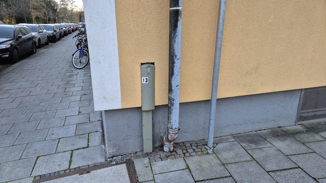 Eine der beiden Röhren der Hängeleuchte über der Kreuzung Sandartstr/Veit-Stoß-str. ist ausgefallen. Eine Mastnummer ist mangels Mast nicht eindeutig erkennbar aber in der Nähe am Hauseck befindet sich ein Klemmkasten mit der #13