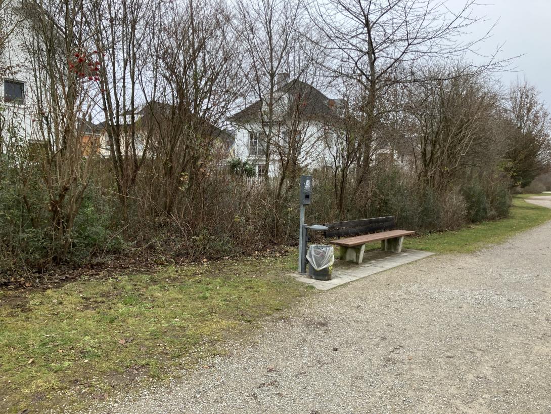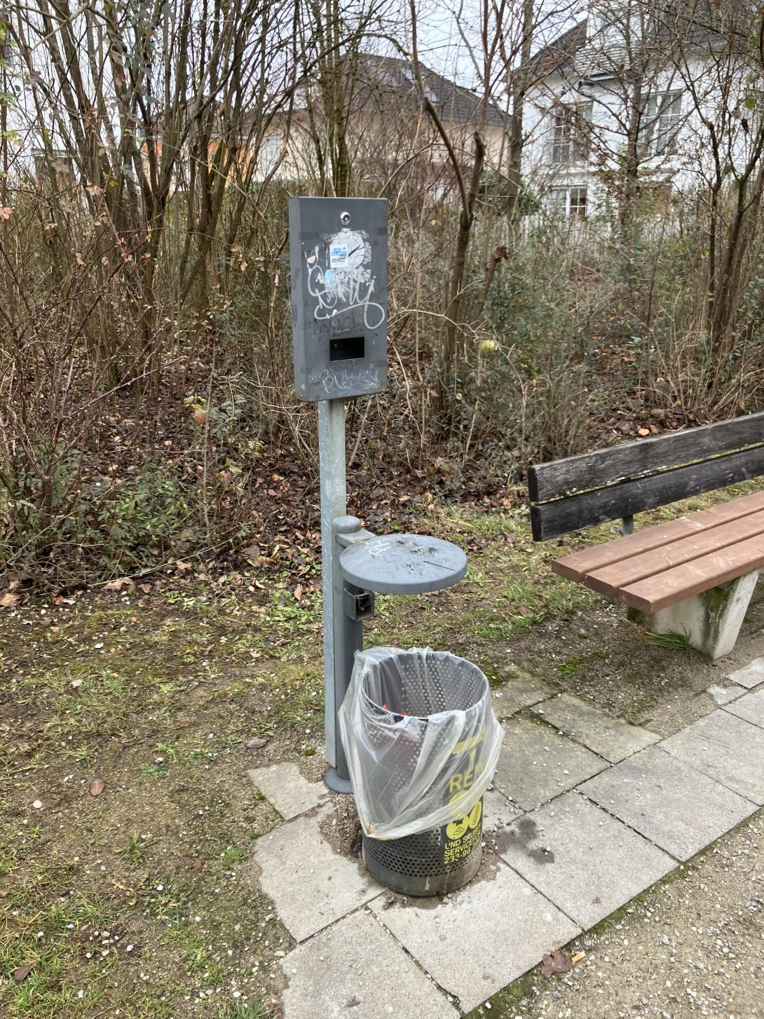 Im Feldbergpark am Ernst-Hochholzer-Fußweg, nahe der Augustinusstraße ist der Mülleimer defekt und der Hundekotbeutelspender ist leer — ersteres ist schon seit etlichen Monaten so.