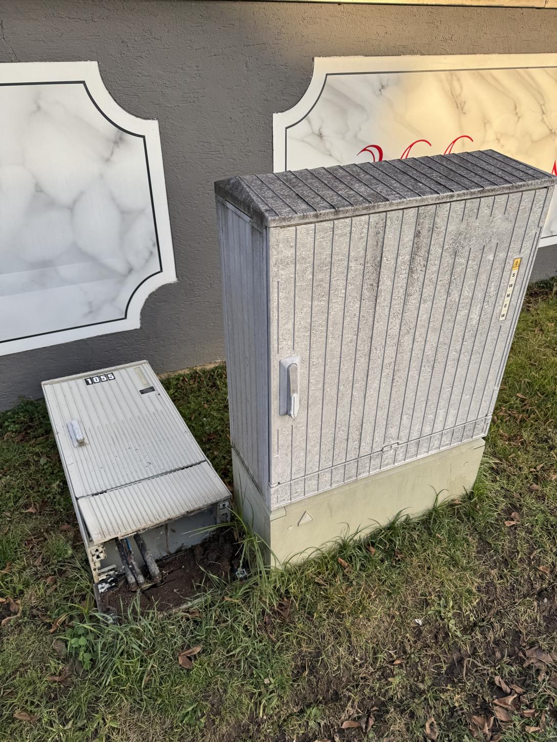 Grauer Kasten für Straßenbeleuchtung aus Verankerung gerissen