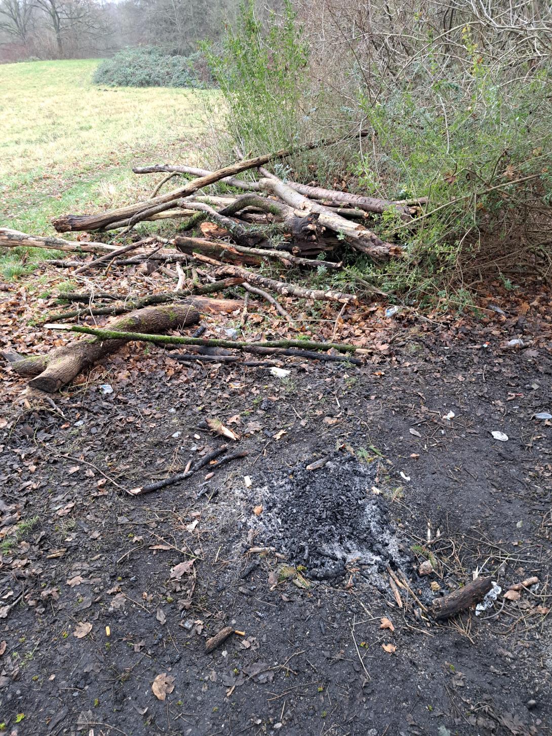 Am Feldmochinger See, oberhalb des FKK Bereichs, wurde ein Lagerfeuer gemacht. Es wurde Holz gesammelt und unter der Sitzbank ein Lagerfeuer angezündet.