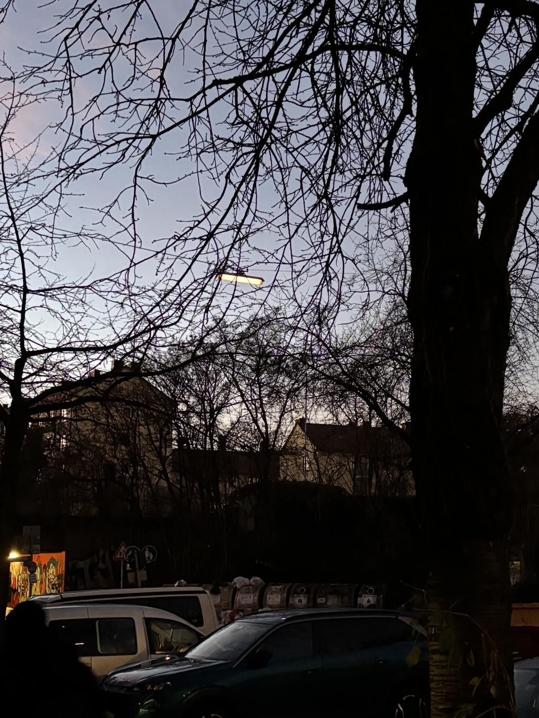 Straßenlampe sehr dunkel, im Gegensatz zu den anderen Laternen. Die Gehwegseite wird kaum ausgeleuchtet.