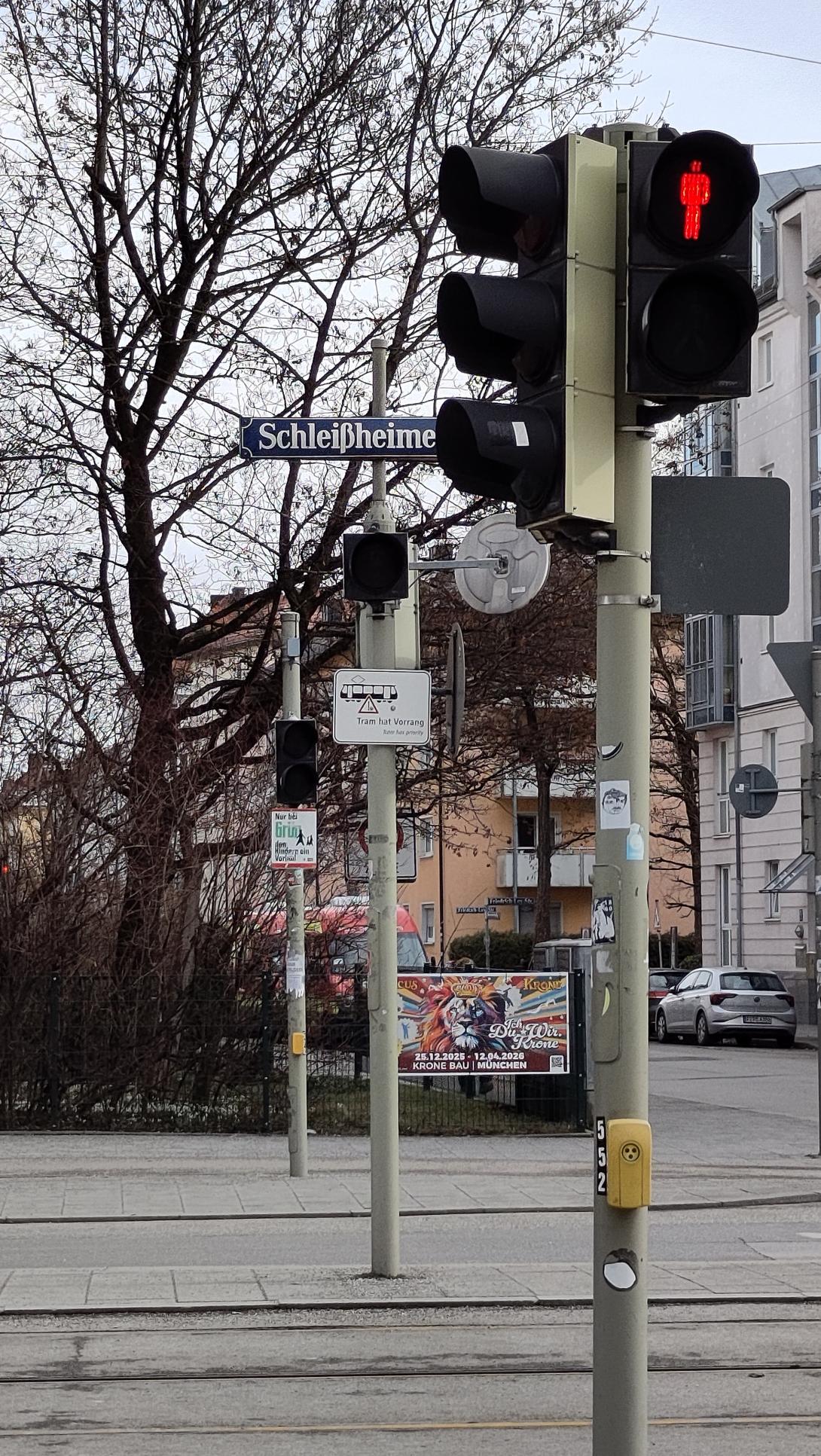 Rot der Fußgängerampel leuchtet fast nicht, siehe Ampel im Hintergrund im Bild