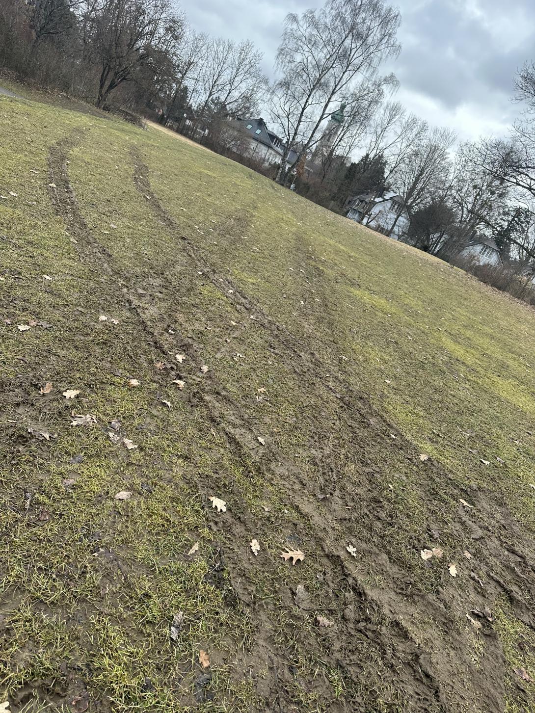 Statt die zwei kleineMülleimer per Hand zu leeren, wurde ein Transporter quer über die Wiese gesteuert. Der Boden ist nun völlig zerstört und Kinder stolpern in den Fahrspuren. Bitte zukünftig auf das Befahren per Fahrzeug verzichten. Vielen Dank!