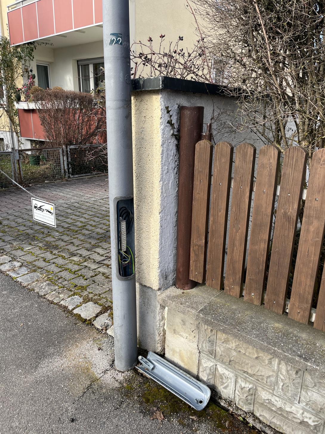 Die graue Abdeckung am Laternenmast unten ist abgefallen und liegt auf dem Gehweg.