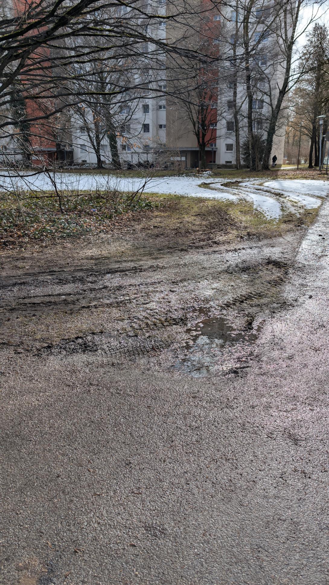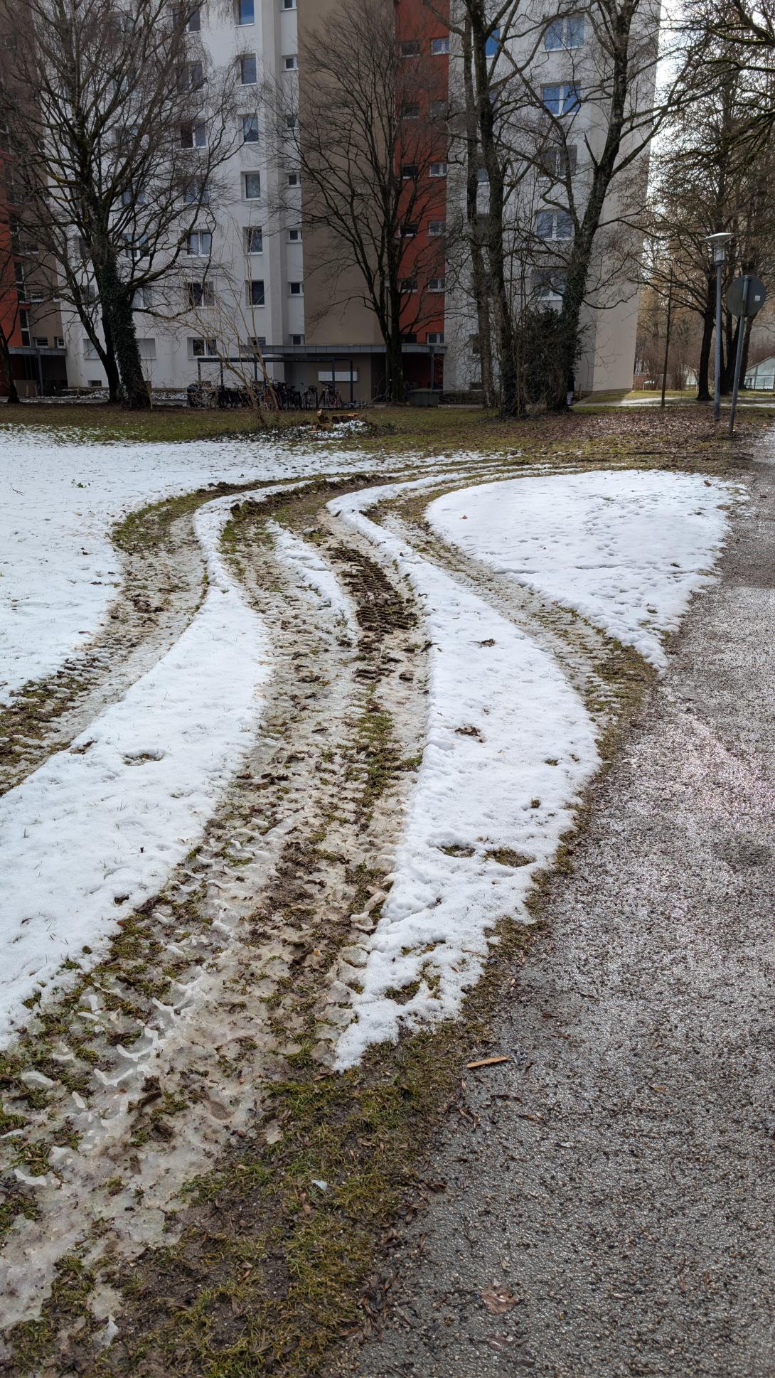 Weg zwischen Karl-Marx-Ring und Max-Beckmann-Str.: Eigentlich entgegenkommend, dass der Weg regelmäßig vom Winterdienst der Stadt geräumt wird - die Fahrer*in freut sich aber scheinbar so sehr über die letzte Gehaltserhöhung, dass sie Pirouetten dreht und die Ecken restlos ruiniert - schade.