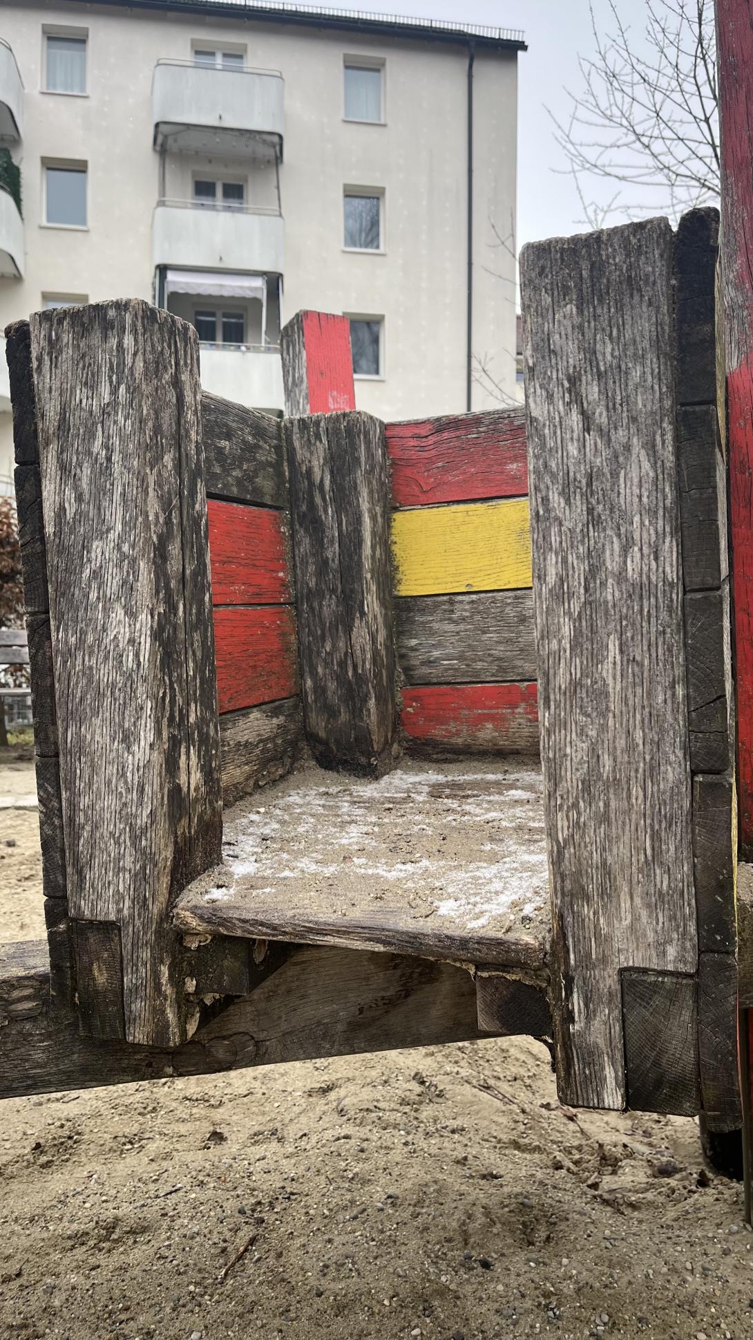 Die Spielgeräte sind aus Holz, viele Teile sind morsch, es ragen Schiefer hervor, es besteht leichte Verletzungsgefahr,da sie sehr veraltet sind, es Bedarf dringend an Erneuerung. Die Schaukeln fehlen. Die Grünfläche ist riesig, so dass man wirklich was sicheres und ansprechenderes