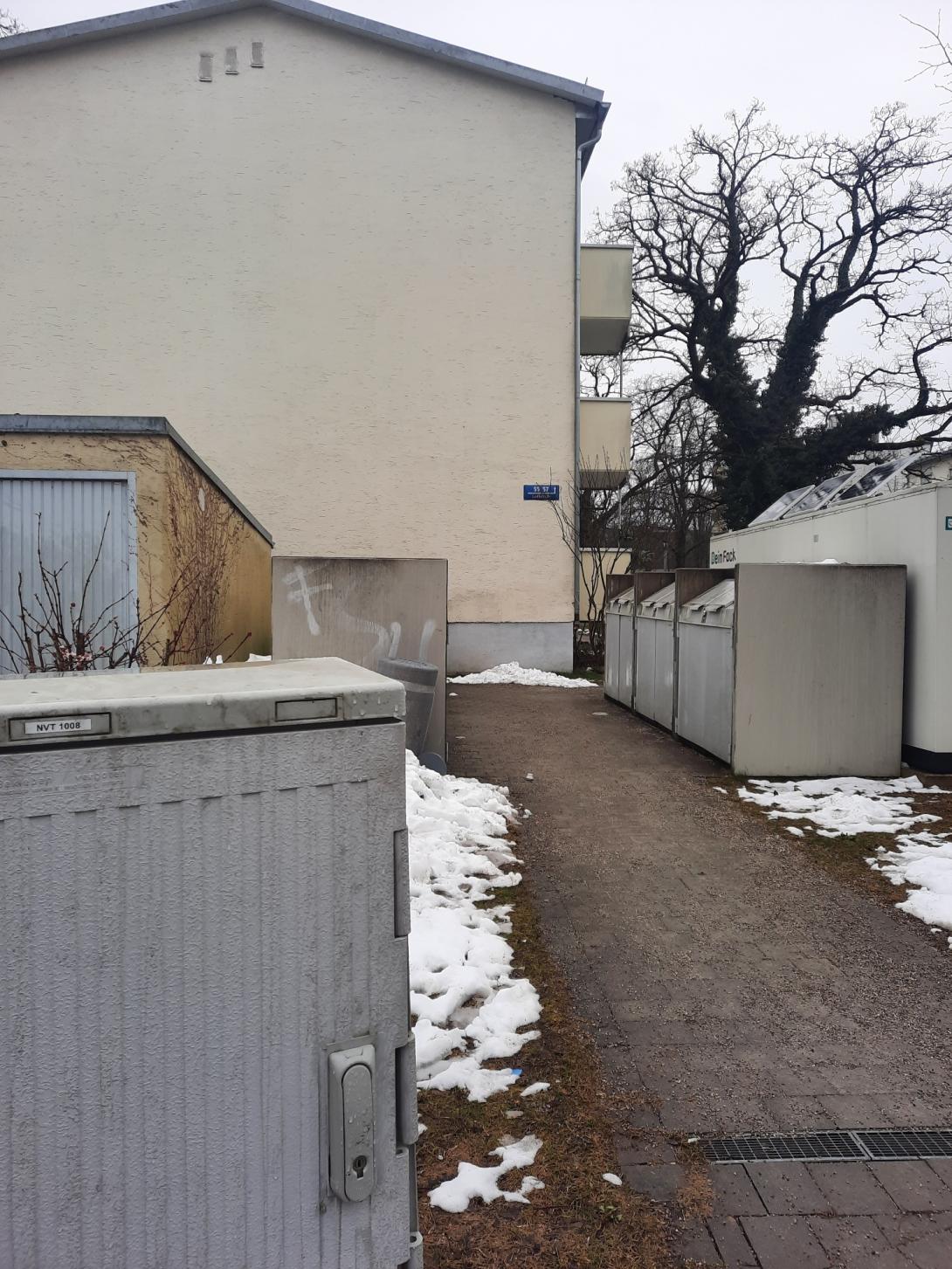 Vor dem Gebäude Ludlstr. 55, München, steht ein kaputter Verteilerschrank (vermutlich Glasfasernetz) mit der Beschriftung NVT 1008.