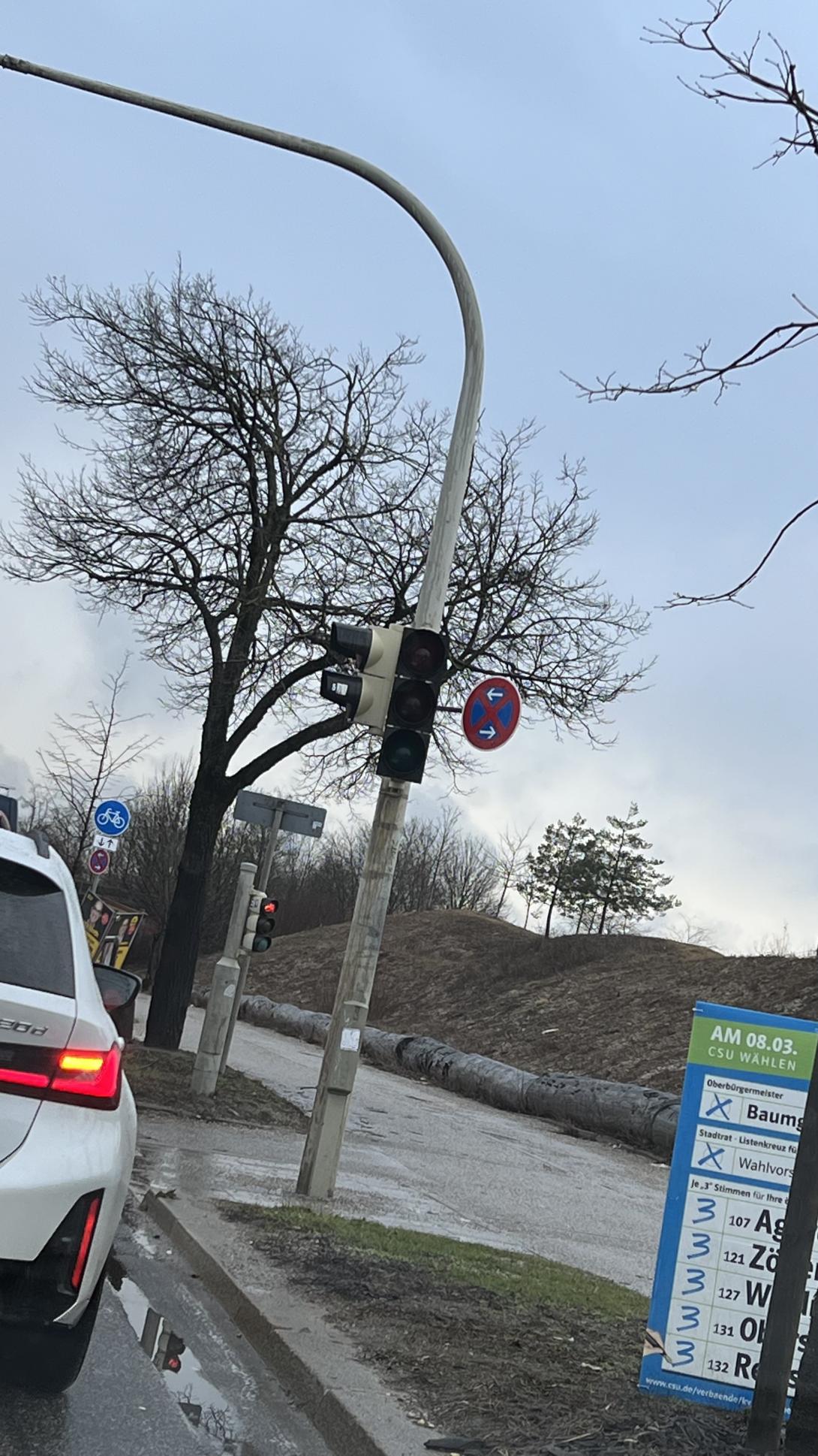 das grüne Licht der Ampel auf der rechten Spur, kommend von Osten, Fahrtrichtung Westen an der Ecke Moosacher Str./Landshuter Allee ist defekt. Siehe Foto.