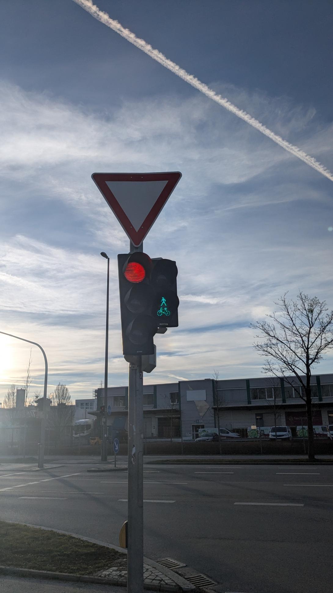 Fußgänger Teil der Ampel ist zur Seite gedreht, wodurch nicht mehr gesehen werden kann ob die Ampel rot ist
