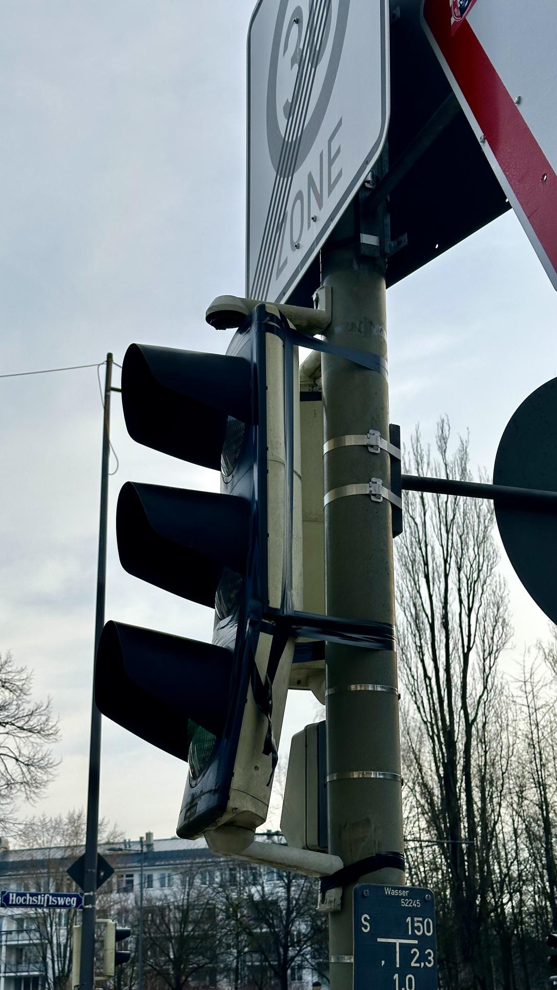 Die Ampelaufhängung ist oben abgebrochen und die Ampel ist nur noch mit Klebeband fixiert