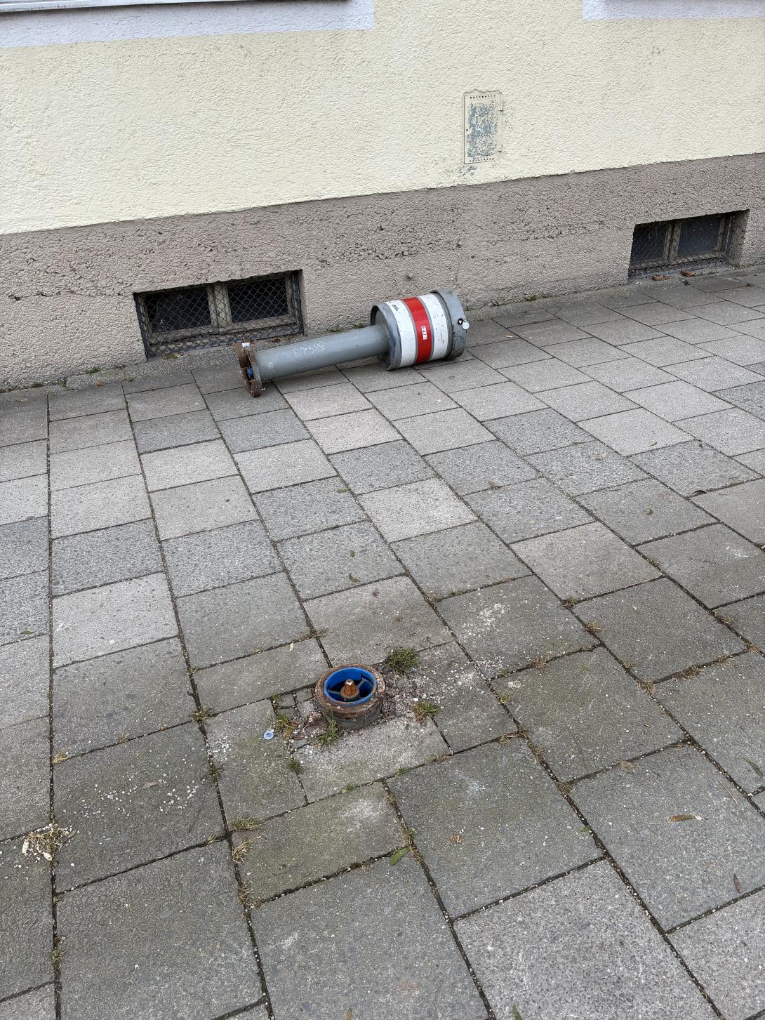 Hydrant abgerissen, wurde vor Haus Anzinger Str. 22 gelegt. Ein Teil steht über die Gehwegoberfläche hinaus.