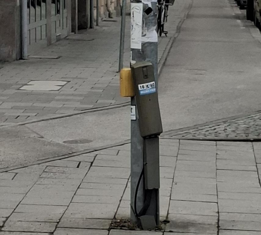 grauer Kasten am Ampelmast schief, vor Kino bei Ampel in Nympenburgstrasse