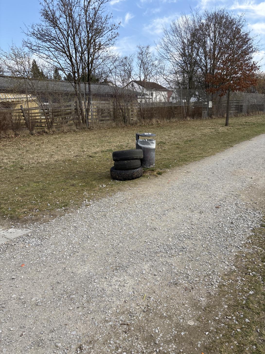 Autoreifen liegen neben Mülleimer
