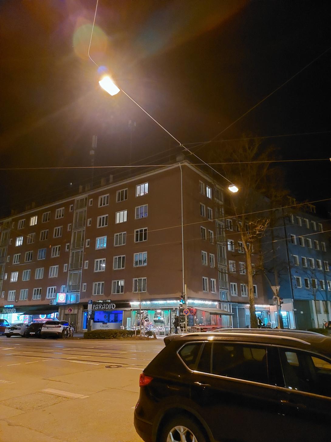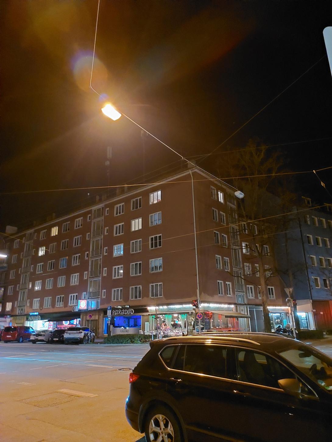 Leuchte aufgehängt in Straßenmitte geht immer an und aus, Kreuzung Belgradstr. / Destouchestr.