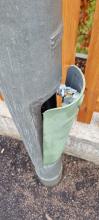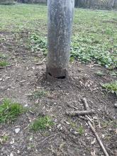 Vor Monaten wurde die Leuchte abgebaut, das Unterteil gegen Feuchtigkeit gesichert und der Lichtmast liegt jetzt am Straßenrand direkt vo