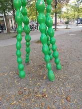 Auf Teilen der Skulptur aus aufeinander gestapelten Parkbänken hat sich ein hässlicher schwarzer Belag gebildet.