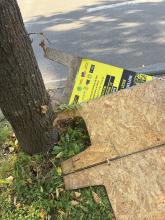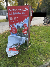 Gesamtes Lampengehäuse heruntergefallen, Energiesparlamoe liegt am Betonsockel der Begrünungsberandung.