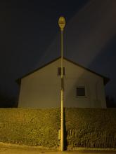 Laterne Nr. 11: beide Leuchtstoffröhren glimmen nur noch sehr dunkel. Straße dunkel