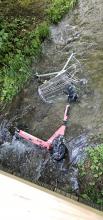 Gegenüber von 46 zwischen Straße und Kanal liegt ein Fahrradtorso