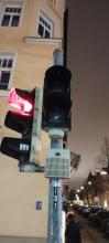 Rote Fußgängerampel an der Kreuzung Theresienstrasse und Luisenstrasse ausgefallen (nordoestlicher Ampelmast bei der Fußgängerueberquerun