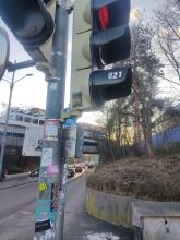 Die Taste zum Anfordern der auf dem Foto markierten Ampel scheint teilweise defekt zu sein.