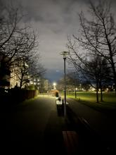 Neben der großen Wiese ist eine Gehwegleuchte ausgefallen.
