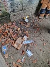 Wieder Vermüllung mit Schnapsflaschen, Bierdosen und weiterem Müll auf dem Spielplatz.