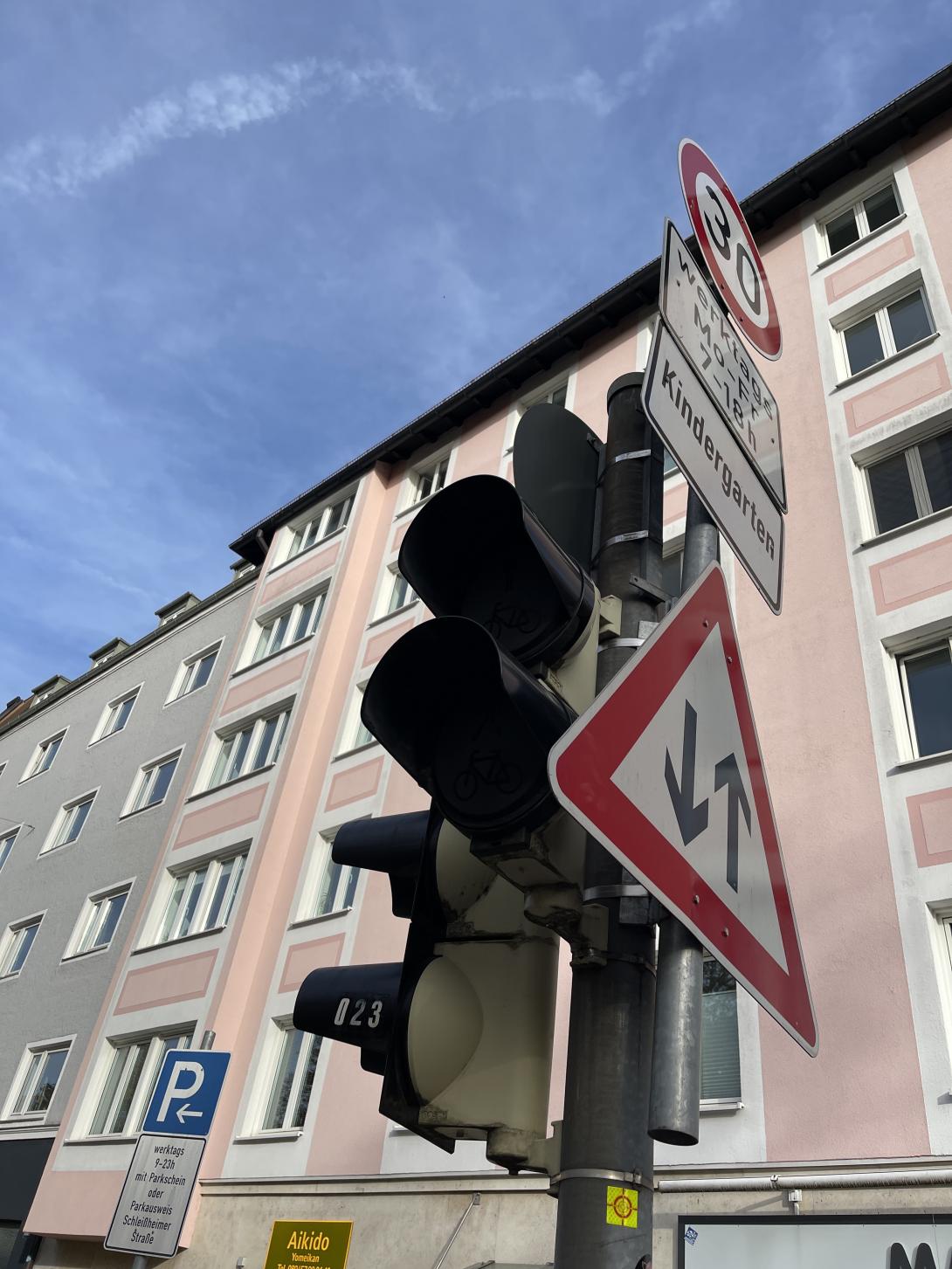 Die Fußgänger Ampel an der Ecke, Schleißheimer Straße und Maßmannstraße auf der Seite von Matratzen Concord leuchtet nicht rot. Grün funktioniert.