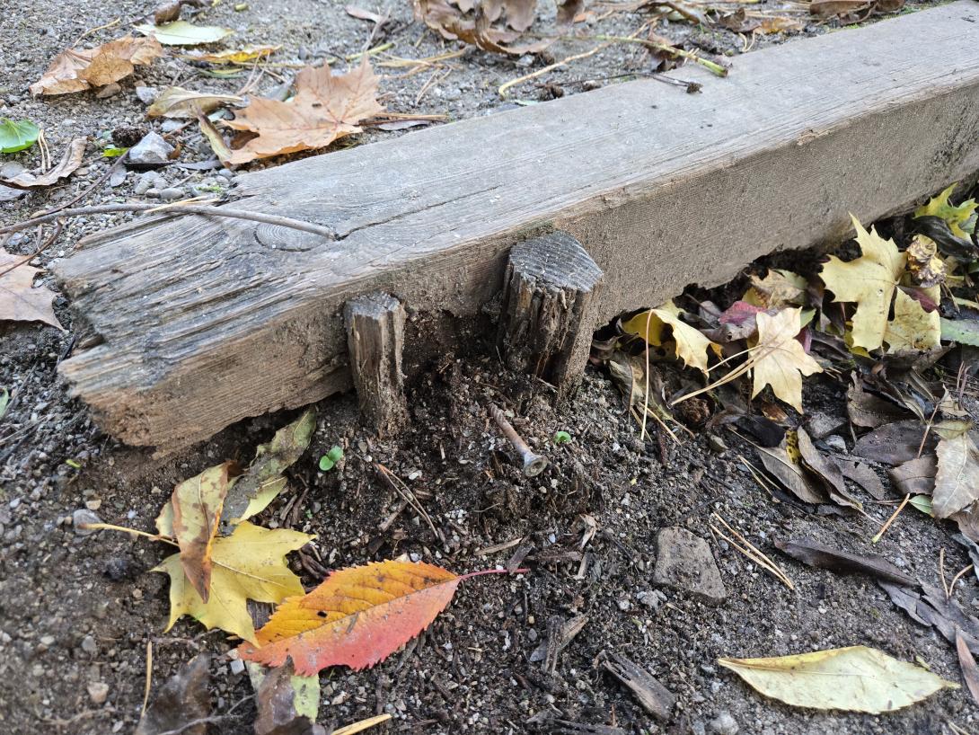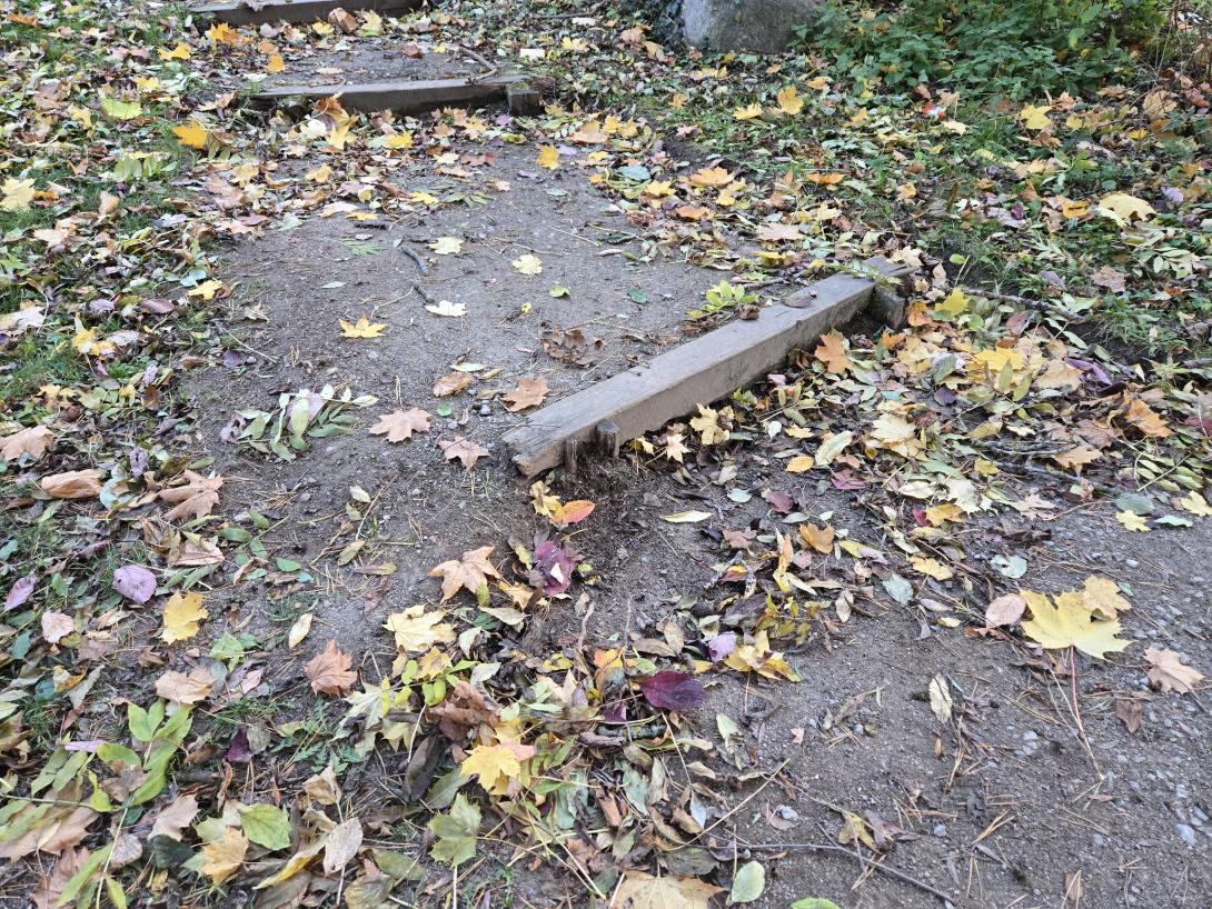 Ein paar Meter neben der kleineren Rutsche gibt es eine Holztreppe mit flachen Stufen. An fast jeder der Stufen schauen spitze Nägel heraus. Das ist gerade beim Spielplatz sehr gefährlich!