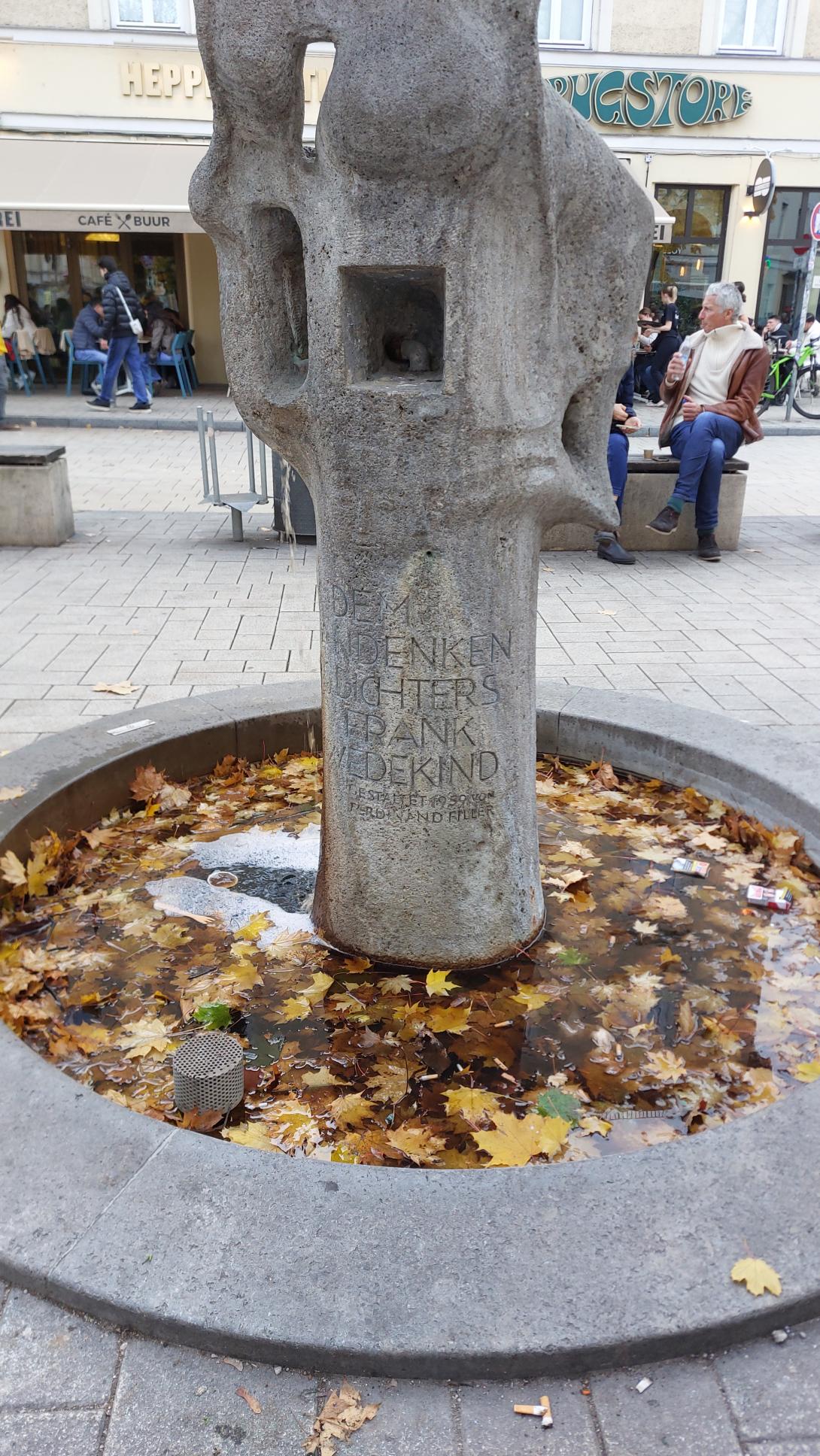 Brunnen am Wedekindplatz ist komplett voller Laub und Müll. Wasser, das aus Brunnen sprudelt ist braun