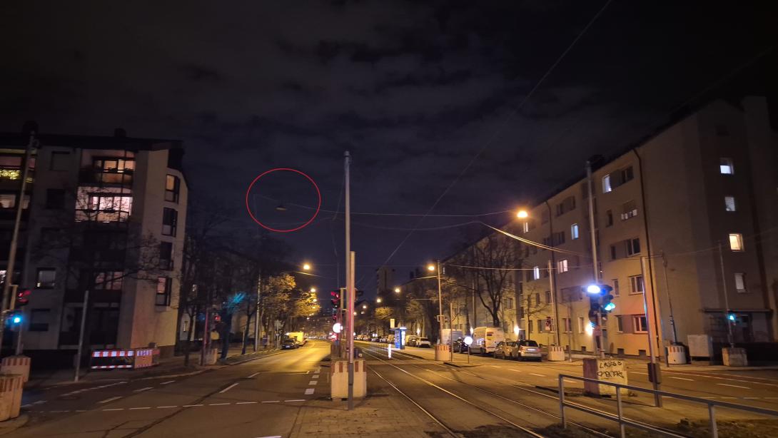 über der Kreuzung Westendstr./Droste-Hülshoff-Str. hängen an einem Seil über die Straße 2 runde Leuchten. Die westliche, die über der Fahrspur Richtung S/W bzw. stadtauswärts hängt, ist ausgefallen.