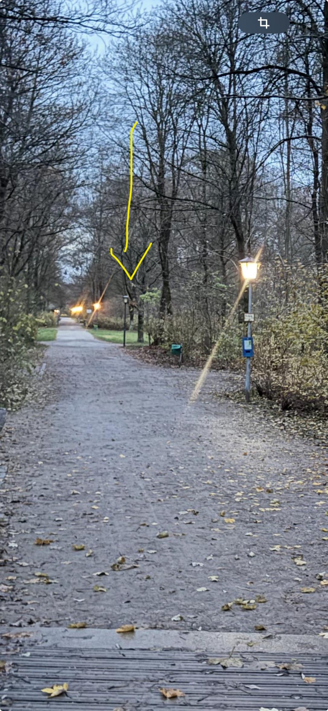 Beim Zugang zum Enlischen Garten von der Schwedenstraße aus ist im Ernst-Pentoldz-Weg die erste Laterne vor der Brücke über den Schwabinger Bach und die zweite Laterne nach der Brücke ausgefallen