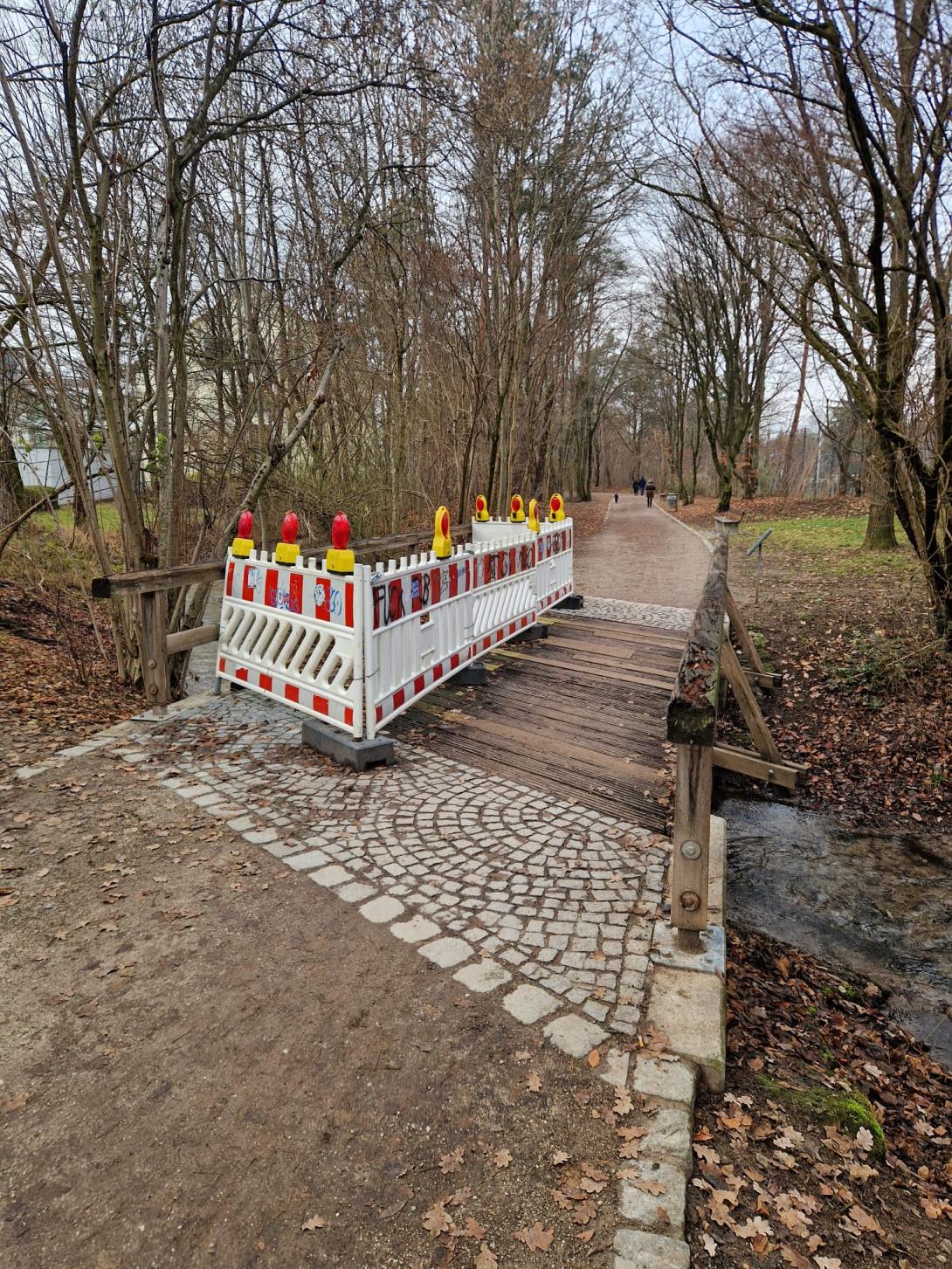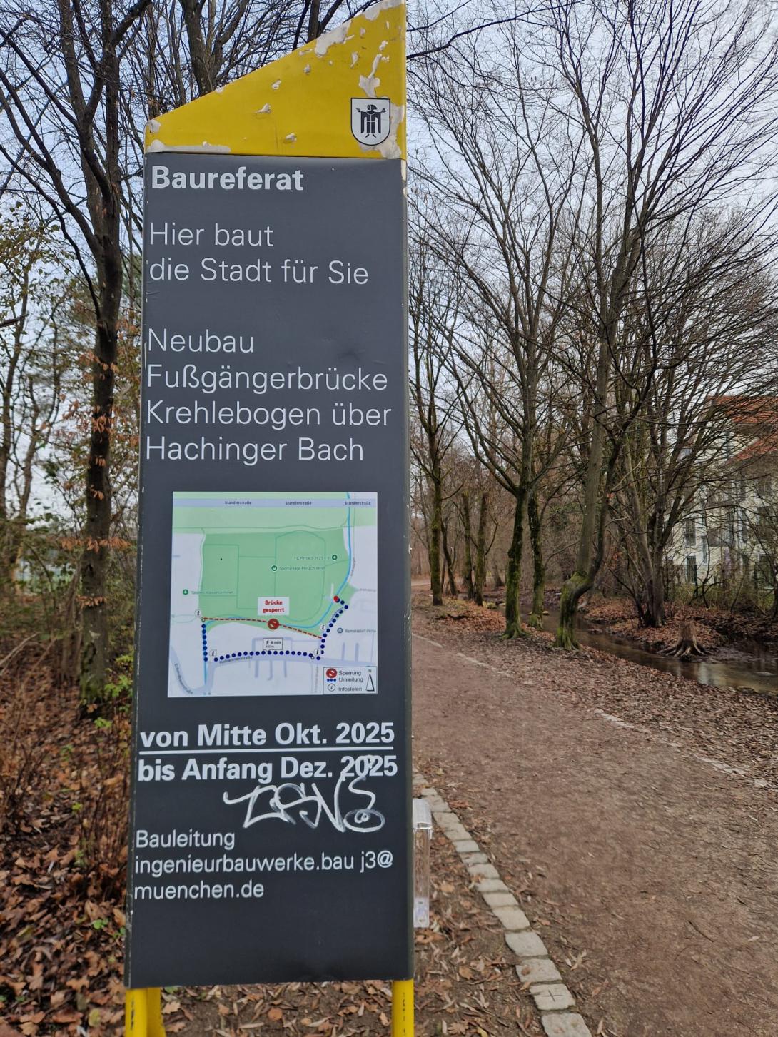 Die Brücke über den Hachinger Bach in der Grünanlage Krehlebogen (s. Foto) ist seit über 2 Jahren halbseitig gesperrt! Seit Mitte NOVEMBER 2025 sind Beschilderungen für "angebliche" Bauarbeiten (bis Anfang Dezember '25) aufgestellt? Bis heute, 2. Dezember, wurde noch überhaupt nichts gemacht?