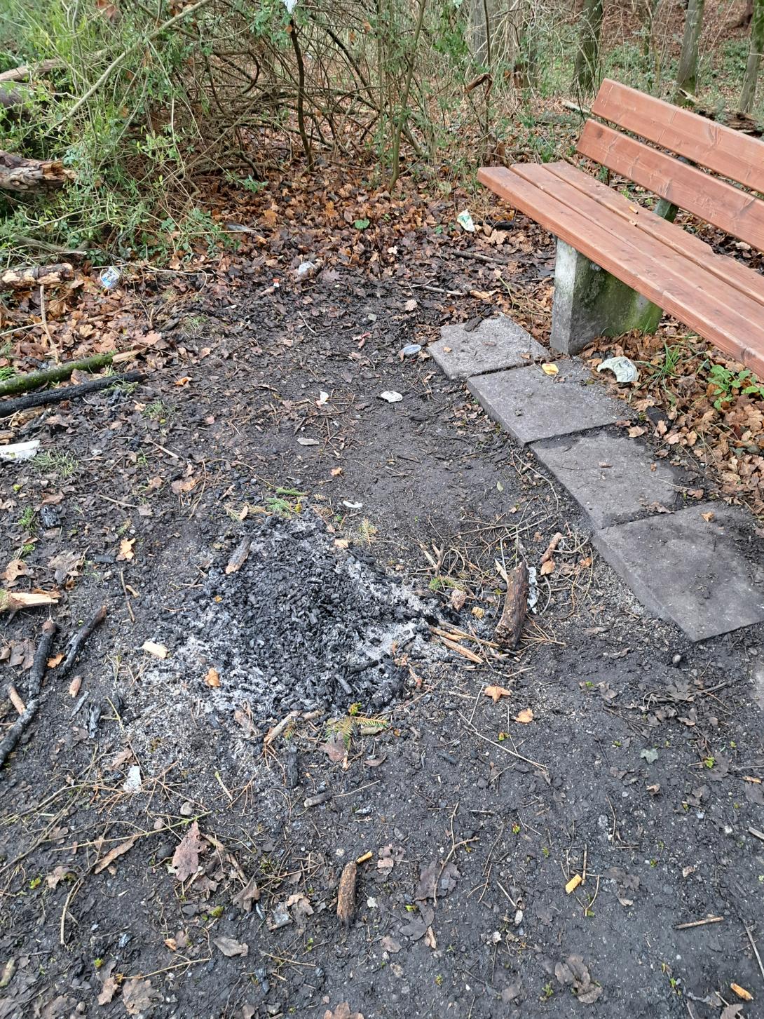 Am Feldmochinger See, oberhalb des FKK Bereichs, wurde ein Lagerfeuer gemacht. Es wurde Holz gesammelt und unter der Sitzbank ein Lagerfeuer angezündet.