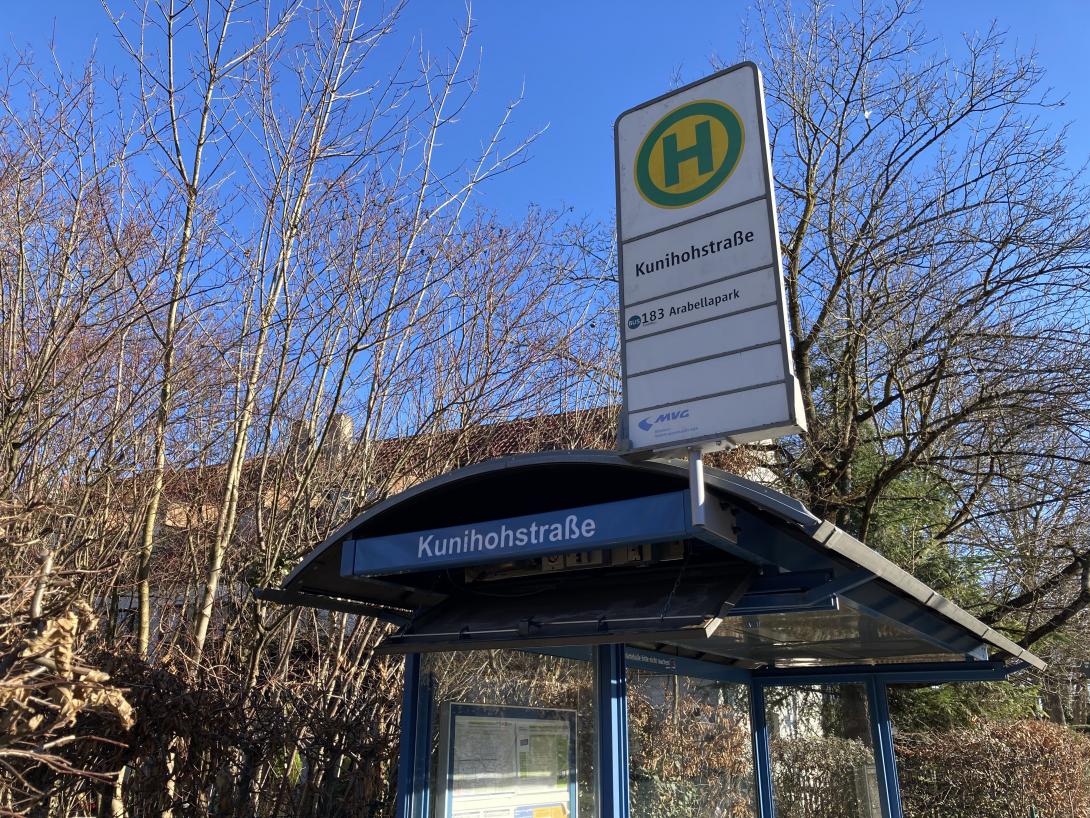 Haltestelle Kunihohstraße, Richtung Arabellapark: Abdeckung der Elektrik am Wartehäuschen ist offen
