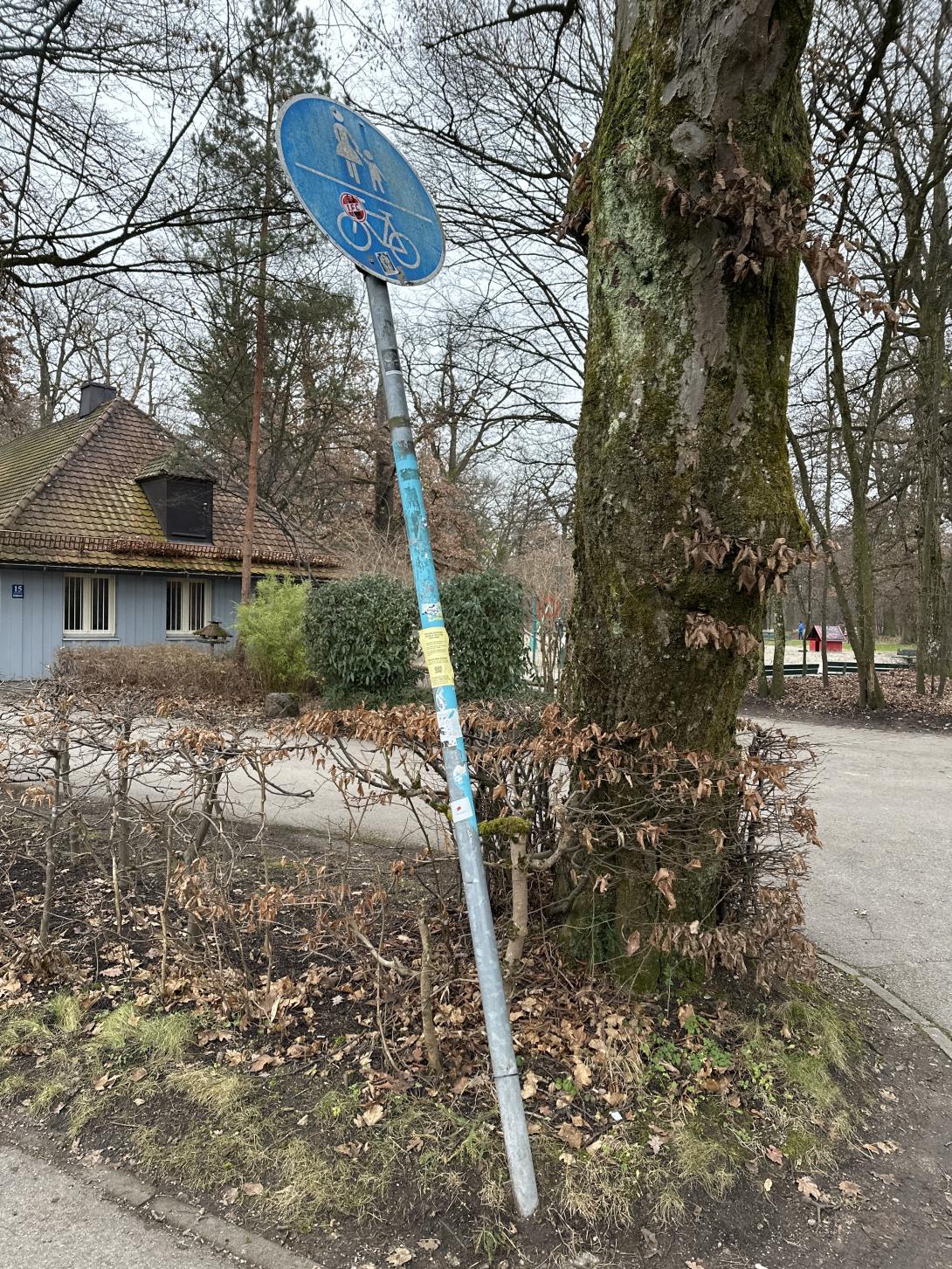 Verkehrsschild verbogen, beklebt, verschmiert etc.