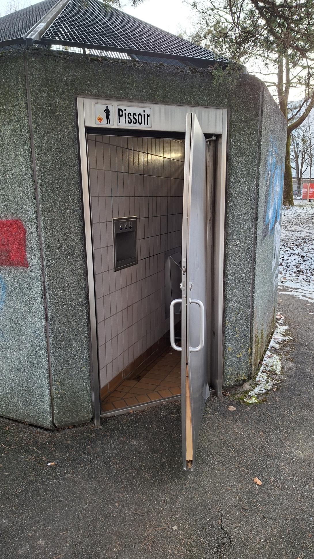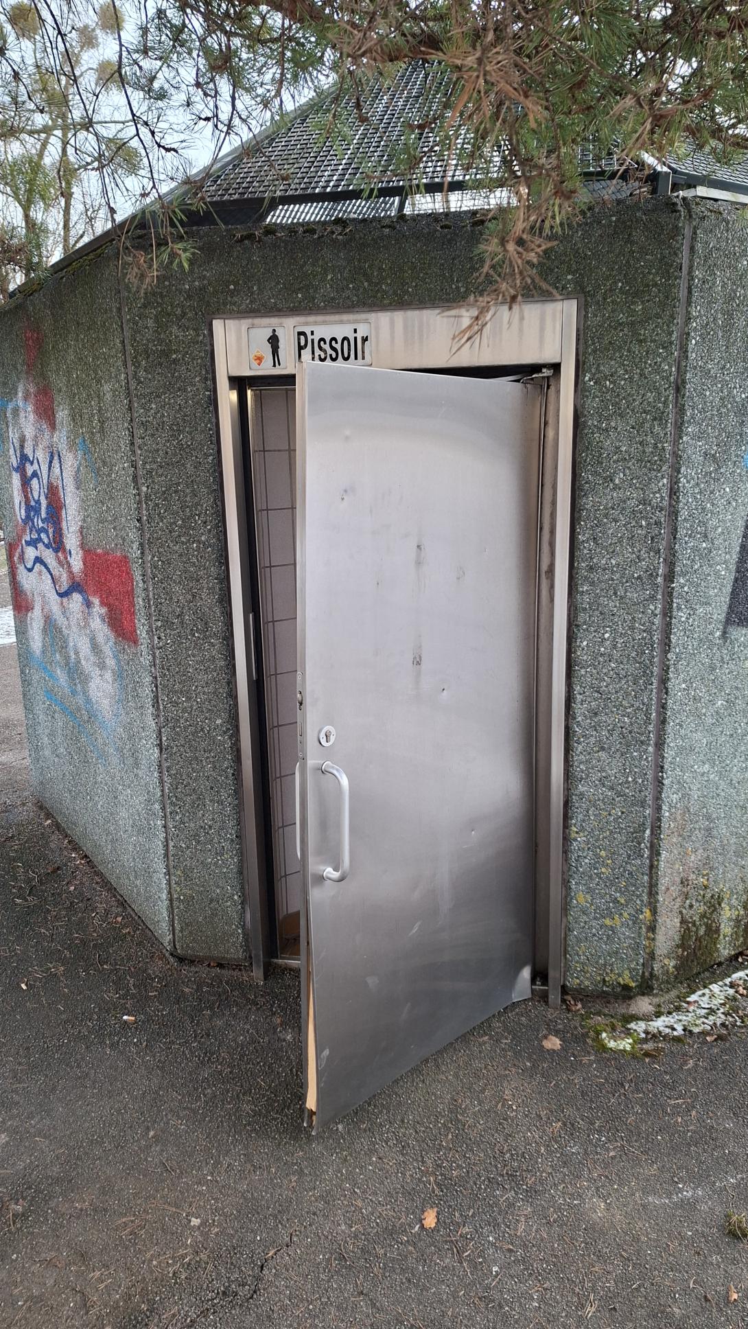 Die Außentür der WC Anlage ist aufgebrochen. Das Pissoir ist nicht mehr frostfrei! Vorsicht Rohrbruch möglich! Eine neue Alutür wird benötigt.