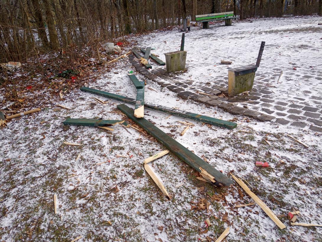 Zerstörte Parkbank, zersplitterte Balken und viel Sylvestermüll