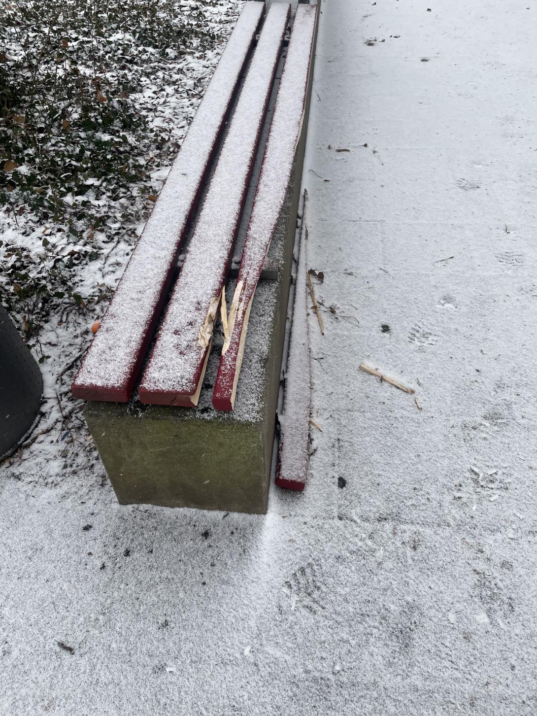 In der dortigen Parkanlage ist eine Parkbank beschädigt (Sitzbretter gelöst/gebrochen, siehe Foto). Bitte um Prüfung und Instandsetzung.