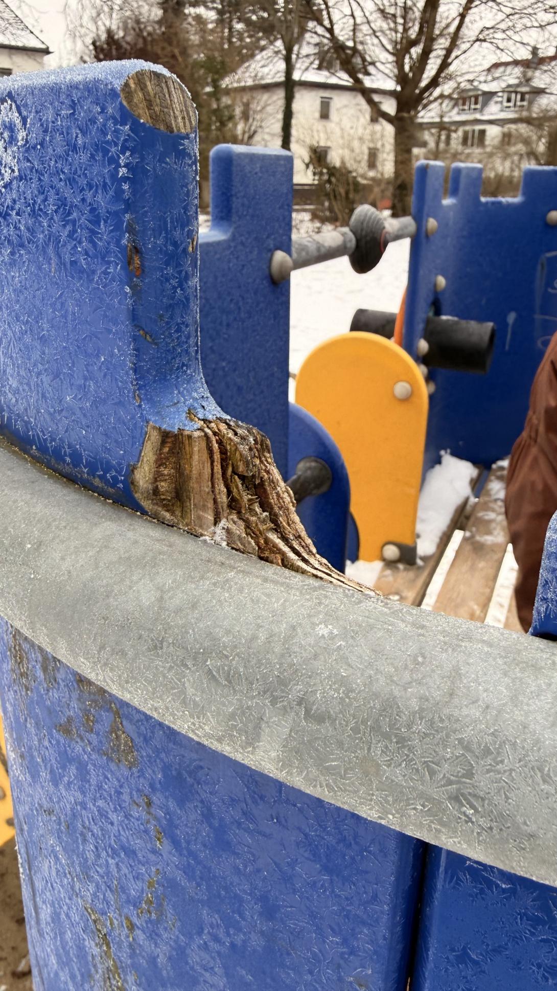 Der Spielturm der Rutsche hat eine Beschädigung am Holz der blauen Brüstung. Ebenfalls wurden in den schwarzen Rohren Feuerwerkskörper gezündet so dass diese beschädigt wurden.