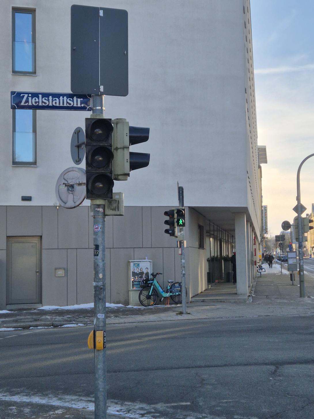 Ecke Passauerstraße mit Zielstattstraße. Am Ampelmast auf der linken Seite funktioniert das grün nicht.