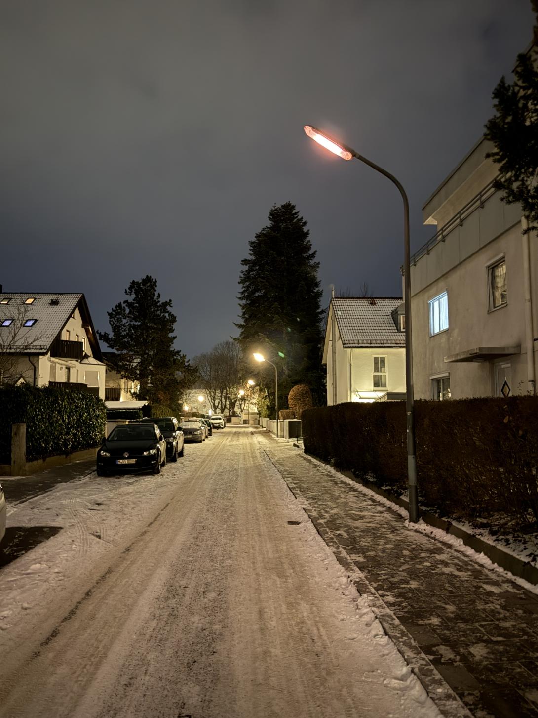 Straßenlaterne leuchtet fast gar nicht mehr. Sieht auf dem ersten mitgeschickten Bild heller aus, als es tatsächlich ist, aber dir Hausbeleichtung des Nachbarn ist heller als die Straßenlaterne. Auf dem zweiten Bild kann man erkennen, dass die Straßenlaternen weiter hinten viel heller leuchten.