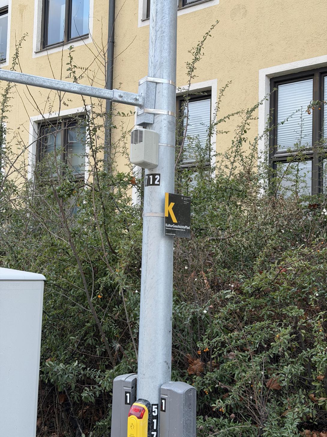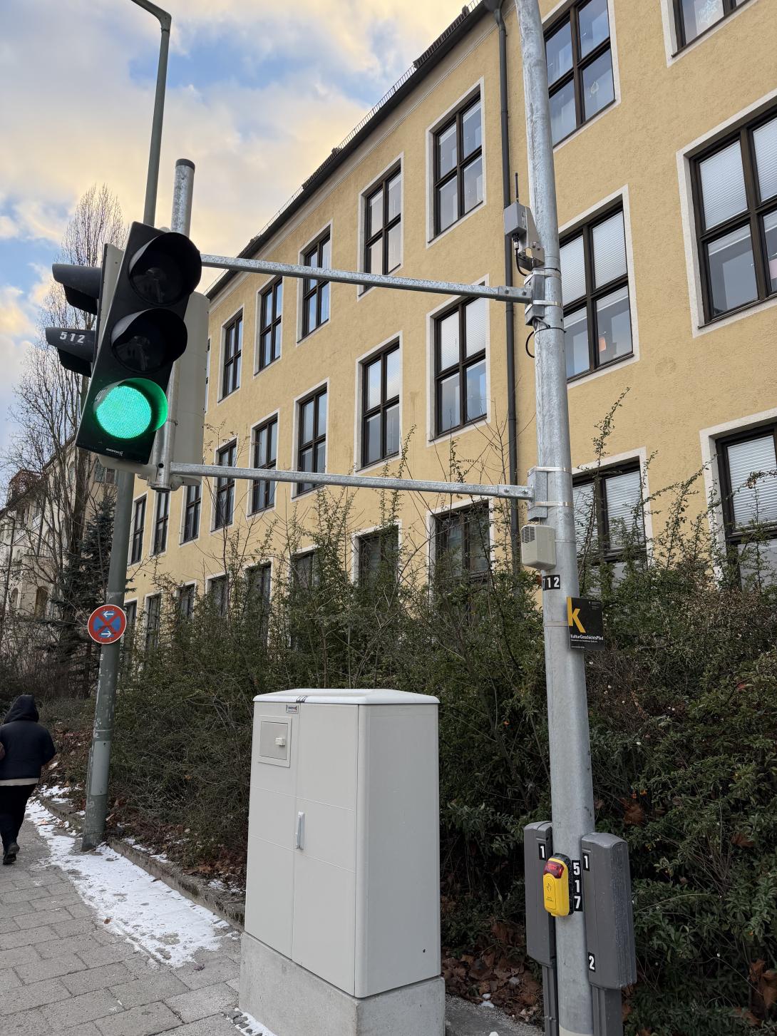 Die Fußgängerampel hängt schief und die Aufhängung scheint verschoben.