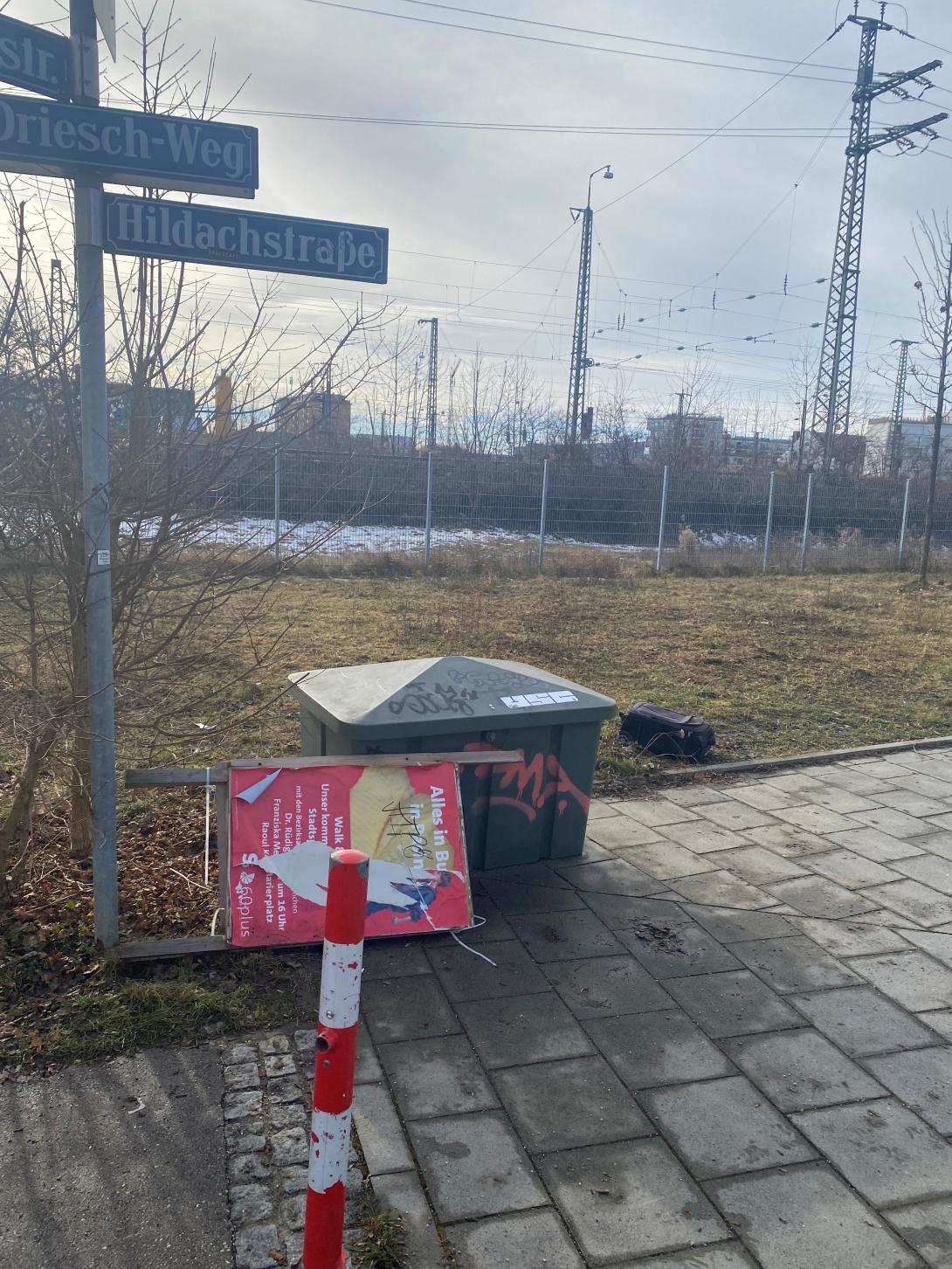 In obenstehender Adresse ist der Zaun am Grünstreifen zusammengebrochen. Auf der Wiese nebenan liegt ein Plakatständer SPD und ein Koffer. Ich bitte um Reparatur und Entsorgung.