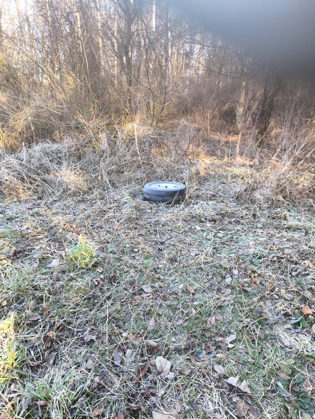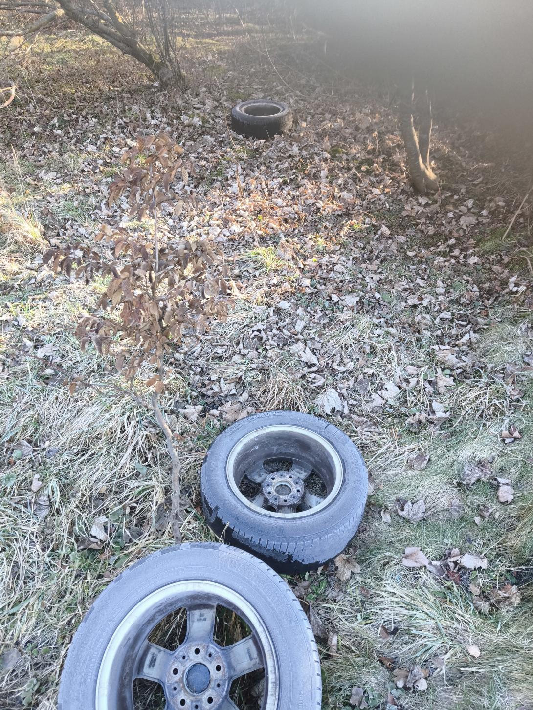 In der Langwieder Heide im Gebüsch parallel zur Negrellistraße liegt ein kompletter Satz illegal abgelegter Autoreifen.