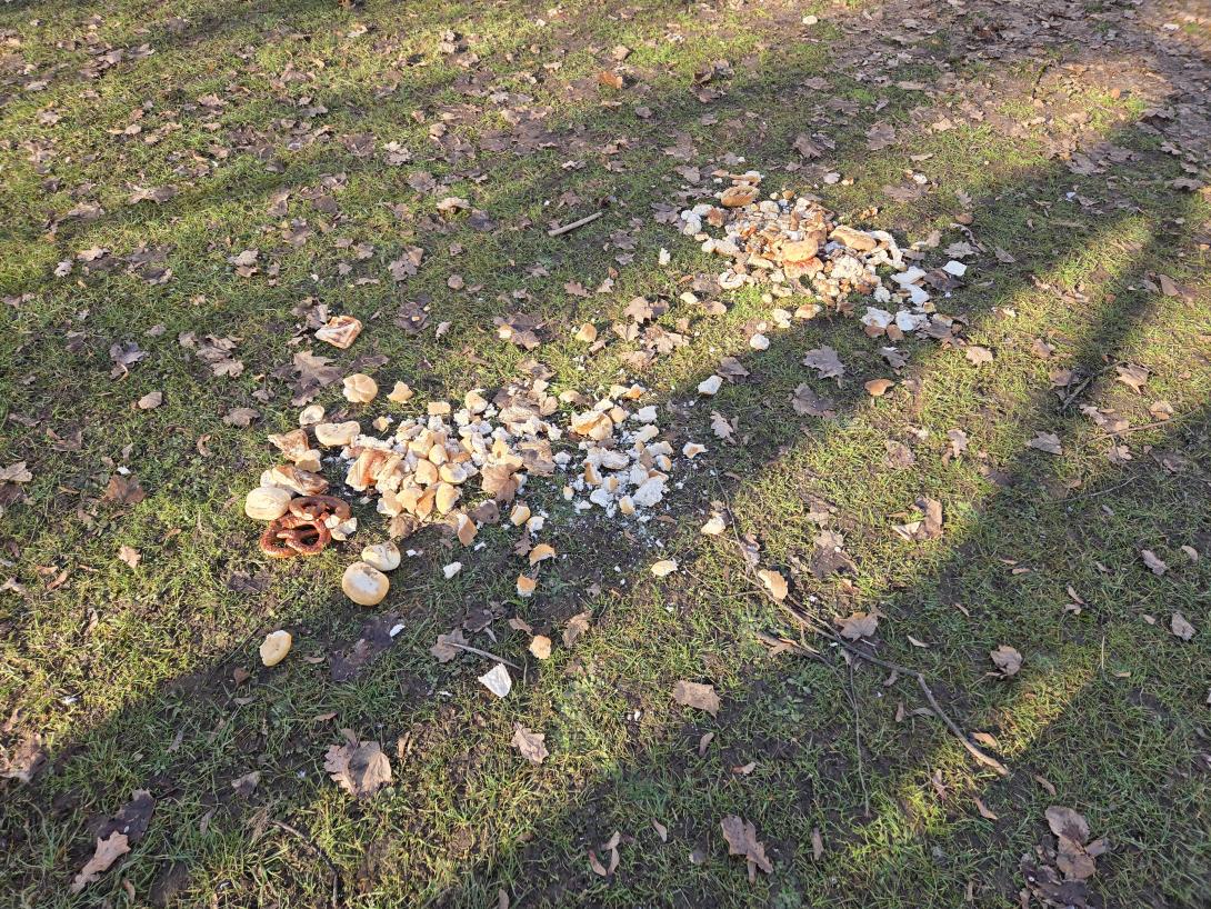 Jemand kippt Brotreste auf die Grünfläche und füttert Tauben an. Abends sieht man dann Ratten fressen.